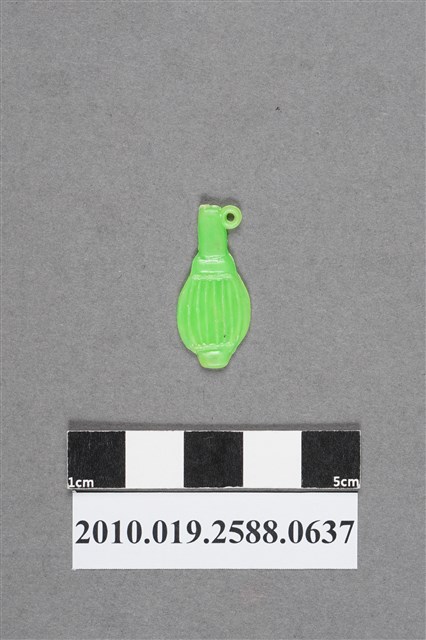 1.本物件為螺造型尪仔仙,為綠色塑膠材質。外型為螺,為俯視角度,前端為螺首,右側有射出痕,左側有圓環,中間為有直紋凹凸痕的螺殼,凸出的部分呈白色磨損痕跡,尾端為斧足。物件背面與正面同,螺首及螺殼有較明顯的磨損痕跡及污痕。本系列尪仔仙多為相同塑膠模版,僅有顏色不同,或是同色同塑膠模版等形式。