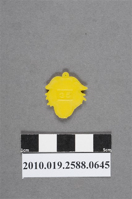 1.本物件為人物頭像造型尪仔仙,為黃色塑膠材質。外型為人物頭像,頭頂有兩支向前生長的螺旋狀角,角上方有圓環。臉部似乎戴了面具,表情猙獰,兩頰有刺狀物,口部有兩支向下生長的獠牙,下頷部有粗橫紋,末端有射出痕。物件背面平整,中有方框,內有「35」字樣。本系列尪仔仙多為相同塑膠模版,僅有顏色不同,或是同色同塑膠模版等形式。