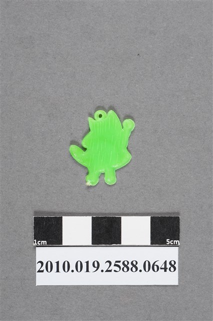 1.本物件為貓造型尪仔仙,為綠色塑膠材質。外型為貓,為擬人狀態,身著裙裝,呈跳舞狀。頭部為貓臉,頭頂有圓形環,單身高舉,另一手置於胸前,似乎拿著一球形物,右側裙邊露出尾巴,裙下為兩腳,右腳腳底有射出痕。物件背面飾有線紋表示皮毛,無衣著結構,正面裙裝可能為單面的圍裙。本系列尪仔仙多為相同塑膠模版,僅有顏色不同,或是同色同塑膠模版等形式。