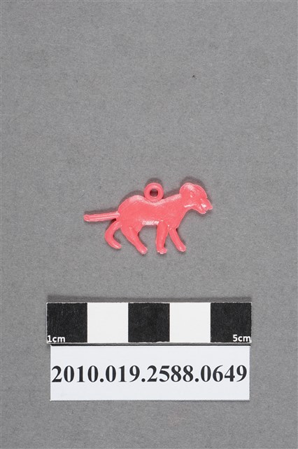 1.本物件為狗造型尪仔仙,為粉紅色塑膠材質。外型為狗,頭部耳朵結構不明顯,嘴巴間有殘膠。背部有圓形環,四肢著地做行走姿勢,第二前肢末端有殘膠,尾巴平舉。物件背面的眼睛位置太過偏上,顯得怪異。本系列尪仔仙多為相同塑膠模版,僅有顏色不同,或是同色同塑膠模版等形式。
