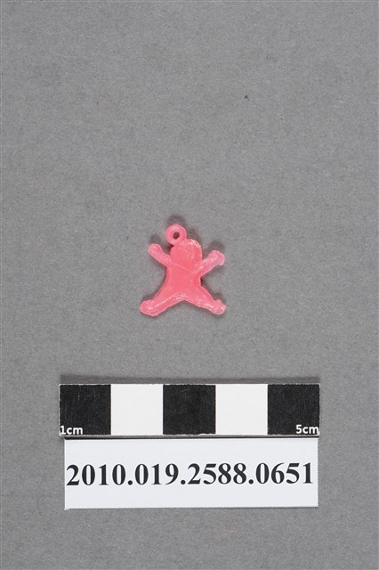 1.本物件為幼童造型尪仔仙,為粉紅色塑膠材質。外型為一幼童,雙手高舉,兩腳分開呈坐姿,臉部隱約可見五官,頭頂偏右側有一圓環。軀幹中間有三顆凸起,應為鈕釦。物件背面布滿刮痕與磨損痕跡。本系列尪仔仙多為相同塑膠模版,僅有顏色不同,或是同色同塑膠模版等形式。2.尪仔仙尺寸大致可分成小、中、大型,小型約長2-5公分,中型約長8-15公分,顏色以單色為主。有些大型的則可長達30公分左右,以菩薩、神仙和民間傳說故事人物等造型為主,塗上金銀紅黃彩漆等亮色。1960、70年代的尪仔仙多以民間傳說故事、歌仔戲、布袋戲人物為造型。1980年代改以卡通、電玩、漫畫人物造型為主。常見玩法之一為兩人(或多人)各持一只尪仔仙,輪流用手指彈射,看誰的尪仔仙先疊在對方上面,便可贏得對方用來對戰或是約定的尪仔仙。