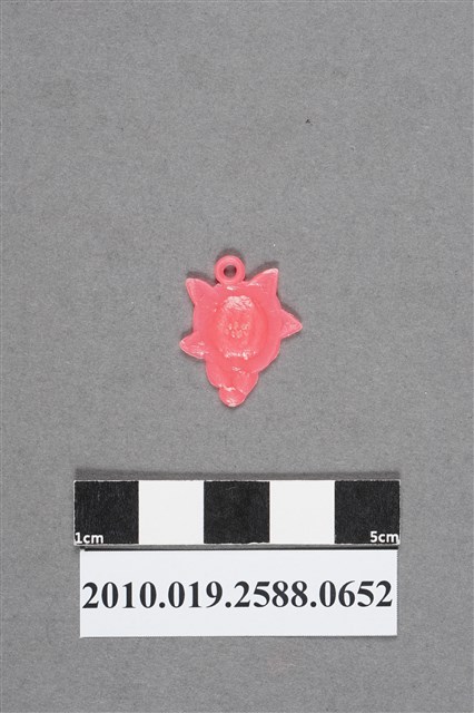 1.本物件為花造型尪仔仙,為粉紅色塑膠材質。外型為花,中間為花芯,內有小點為花蕊,外圍有花瓣及葉片,上方有圓環。物件背面與正面同,僅細部結構較不明顯。本系列尪仔仙多為相同塑膠模版,僅有顏色不同,或是同色同塑膠模版等形式。2.尪仔仙尺寸大致可分成小、中、大型,小型約長2-5公分,中型約長8-15公分,顏色以單色為主。有些大型的則可長達30公分左右,以菩薩、神仙和民間傳說故事人物等造型為主,塗上金銀紅黃彩漆等亮色。1960、70年代的尪仔仙多以民間傳說故事、歌仔戲、布袋戲人物為造型。1980年代改以卡通、電玩、漫畫人物造型為主。常見玩法之一為兩人(或多人)各持一只尪仔仙,輪流用手指彈射,看誰的尪仔仙先疊在對方上面,便可贏得對方用來對戰或是約定的尪仔仙。