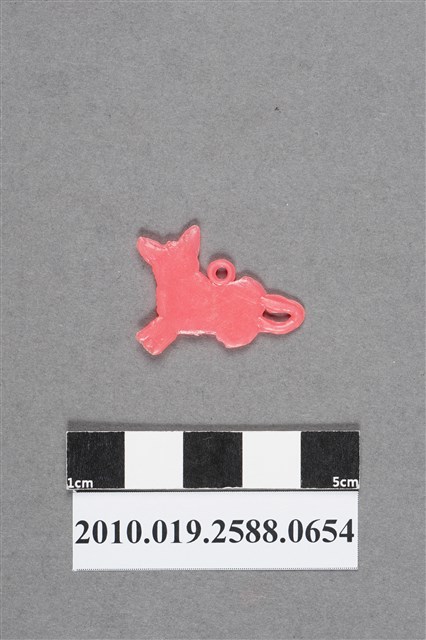 1.本物件為貓造型尪仔仙,為粉紅色塑膠材質。外型為貓,呈趴姿,兩耳豎立,兩耳間、臉周圍及胸前有斜線紋以示毛髮。身體前方有三根柱狀物,應是表示折疊縮起的前肢。後肢曲折,身後有尾巴,背上有圓形環,腹部有射出痕。物件背面平整,有細碎磨痕。本系列尪仔仙多為相同塑膠模版,僅有顏色不同,或是同色同塑膠模版等形式。2.尪仔仙尺寸大致可分成小、中、大型,小型約長2-5公分,中型約長8-15公分,顏色以單色為主。有些大型的則可長達30公分左右,以菩薩、神仙和民間傳說故事人物等造型為主,塗上金銀紅黃彩漆等亮色。1960、70年代的尪仔仙多以民間傳說故事、歌仔戲、布袋戲人物為造型。1980年代改以卡通、電玩、漫畫人物造型為主。常見玩法之一為兩人(或多人)各持一只尪仔仙,輪流用手指彈射,看誰的尪仔仙先疊在對方上面,便可贏得對方用來對戰或是約定的尪仔仙。