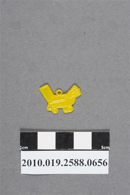 1.本物件為嬰兒車造型尪仔仙,為黃色塑膠材質。外型為嬰兒車,左側呈扇狀物為遮陽棚,末端有射出痕。中間為車身,上有圓環,下有四個車輪,但後輪位置不太正確。右側為握把結構。物件背面與正面同,但可看出後輪的內外情況。本系列尪仔仙多為相同塑膠模版,僅有顏色不同,或是同色同塑膠模版等形式。2.尪仔仙尺寸大致可分成小、中、大型,小型約長2-5公分,中型約長8-15公分,顏色以單色為主。有些大型的則可長達30公分左右,以菩薩、神仙和民間傳說故事人物等造型為主,塗上金銀紅黃彩漆等亮色。1960、70年代的尪仔仙多以民間傳說故事、歌仔戲、布袋戲人物為造型。1980年代改以卡通、電玩、漫畫人物造型為主。常見玩法之一為兩人(或多人)各持一只尪仔仙,輪流用手指彈射,看誰的尪仔仙先疊在對方上面,便可贏得對方用來對戰或是約定的尪仔仙。