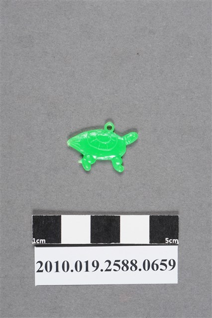 1.本物件為龜造型尪仔仙,為綠色塑膠材質。外型為龜,龜首有眼睛及嘴,脖子有皺摺。龜殼平滑,僅有一內有似太陽狀的圓形紋,龜殼上方有圓環,末端有放射紋及射出痕,下方有兩隻腳,後肢關節端有射出痕。物件背面與正面大致相同,但太陽形紋較歪斜。本系列尪仔仙多為相同塑膠模版,僅有顏色不同,或是同色同塑膠模版等形式。2.尪仔仙尺寸大致可分成小、中、大型,小型約長2-5公分,中型約長8-15公分,顏色以單色為主。有些大型的則可長達30公分左右,以菩薩、神仙和民間傳說故事人物等造型為主,塗上金銀紅黃彩漆等亮色。1960、70年代的尪仔仙多以民間傳說故事、歌仔戲、布袋戲人物為造型。1980年代改以卡通、電玩、漫畫人物造型為主。常見玩法之一為兩人(或多人)各持一只尪仔仙,輪流用手指彈射,看誰的尪仔仙先疊在對方上面,便可贏得對方用來對戰或是約定的尪仔仙。