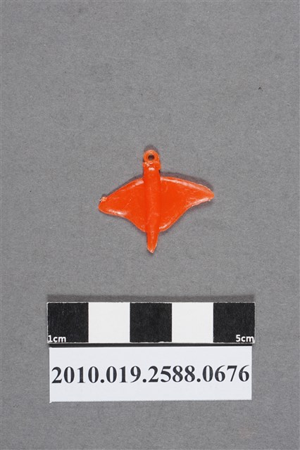 1.本物件為昆蟲尪仔仙。硬質塑膠材質,扁平,單一不透明橘色,雙面浮雕圖案。正面圖案為翅膀張開的昆蟲,有2顆眼睛,形體似飛蛾。有小吊環。2.尪仔仙尺寸大致可分成小、中、大型,小型約長2-5公分,中型約長8-15公分,顏色以單色為主。有些大型的則可長達30公分左右,以菩薩、神仙和民間傳說故事人物等造型為主,塗上金銀紅黃彩漆等亮色。1960、70年代的尪仔仙多以民間傳說故事、歌仔戲、布袋戲人物為造型。1980年代改以卡通、電玩、漫畫人物造型為主。常見玩法之一為兩人(或多人)各持一只尪仔仙,輪流用手指彈射,看誰的尪仔仙先疊在對方上面,便可贏得對方用來對戰或是約定的尪仔仙。