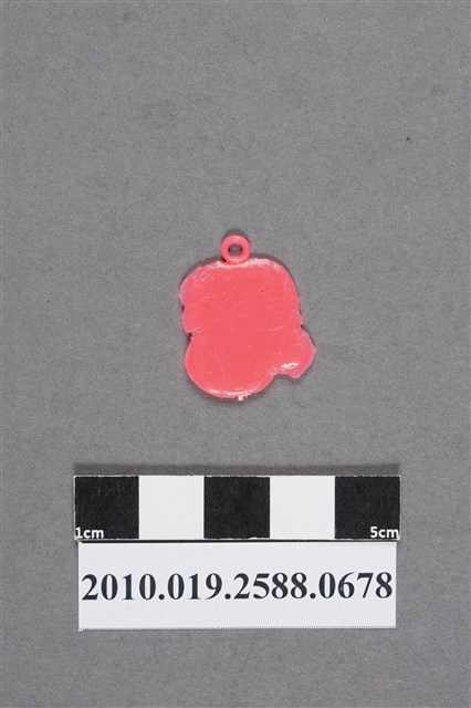 1.本物件為孫悟空頭像尪仔仙。硬質塑膠材質,扁平,單一不透明粉紅色,單面浮雕圖案。正面圖案為戴著金箍的孫悟空頭部,額頭中央可見金箍的造型。頭頂有小吊環。孫悟空為西遊記之角色。