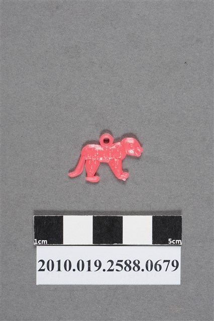 1.本物件為站姿狗型尪仔仙。硬質塑膠材質,扁平,單一不透明粉紅色,雙面浮雕圖案,兩面圖案相同。圖案似狗型,身上有斑點,嘴型似狗式口吻,有尾巴和腿,但不見耳朵。背上有小吊環。2.尪仔仙尺寸大致可分成小、中、大型,小型約長2-5公分,中型約長8-15公分,顏色以單色為主。有些大型的則可長達30公分左右,以菩薩、神仙和民間傳說故事人物等造型為主,塗上金銀紅黃彩漆等亮色。1960、70年代的尪仔仙多以民間傳說故事、歌仔戲、布袋戲人物為造型。1980年代改以卡通、電玩、漫畫人物造型為主。常見玩法之一為兩人(或多人)各持一只尪仔仙,輪流用手指彈射,看誰的尪仔仙先疊在對方上面,便可贏得對方用來對戰或是約定的尪仔仙。