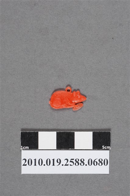 1.本物件為老鼠尪仔仙。硬質塑膠材質,扁平,單一不透明橘色,雙面浮雕圖案,兩面圖案相同。圖案為趴在地上的老鼠,其尾巴縮在身邊。背上有小吊環。2.尪仔仙尺寸大致可分成小、中、大型,小型約長2-5公分,中型約長8-15公分,顏色以單色為主。有些大型的則可長達30公分左右,以菩薩、神仙和民間傳說故事人物等造型為主,塗上金銀紅黃彩漆等亮色。1960、70年代的尪仔仙多以民間傳說故事、歌仔戲、布袋戲人物為造型。1980年代改以卡通、電玩、漫畫人物造型為主。常見玩法之一為兩人(或多人)各持一只尪仔仙,輪流用手指彈射,看誰的尪仔仙先疊在對方上面,便可贏得對方用來對戰或是約定的尪仔仙。