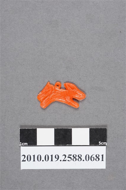 1.本物件為橘色尪仔仙。硬質塑膠材質,扁平,單一不透明橘色,雙面浮雕圖案,兩面圖案相同。圖案似在奔跑的狗型,耳朵往後豎起。有小吊環。2.尪仔仙尺寸大致可分成小、中、大型,小型約長2-5公分,中型約長8-15公分,顏色以單色為主。有些大型的則可長達30公分左右,以菩薩、神仙和民間傳說故事人物等造型為主,塗上金銀紅黃彩漆等亮色。1960、70年代的尪仔仙多以民間傳說故事、歌仔戲、布袋戲人物為造型。1980年代改以卡通、電玩、漫畫人物造型為主。常見玩法之一為兩人(或多人)各持一只尪仔仙,輪流用手指彈射,看誰的尪仔仙先疊在對方上面,便可贏得對方用來對戰或是約定的尪仔仙。
