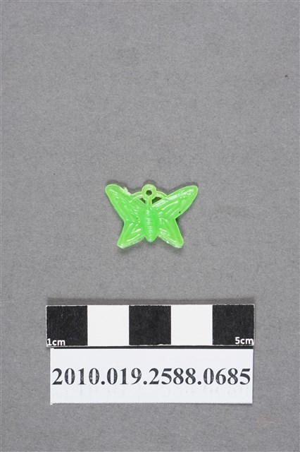 1.本物件為蝴蝶尪仔仙。硬質塑膠材質,扁平,單一不透明綠色,雙面浮雕圖案,兩面圖案相同。圖案為張開翅膀的蝴蝶,軀幹上有橫條紋和觸角。有小吊環。2.尪仔仙尺寸大致可分成小、中、大型,小型約長2-5公分,中型約長8-15公分,顏色以單色為主。有些大型的則可長達30公分左右,以菩薩、神仙和民間傳說故事人物等造型為主,塗上金銀紅黃彩漆等亮色。1960、70年代的尪仔仙多以民間傳說故事、歌仔戲、布袋戲人物為造型。1980年代改以卡通、電玩、漫畫人物造型為主。常見玩法之一為兩人(或多人)各持一只尪仔仙,輪流用手指彈射,看誰的尪仔仙先疊在對方上面,便可贏得對方用來對戰或是約定的尪仔仙。
