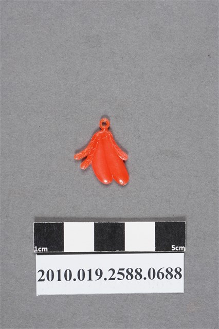 1.本物件為茄子尪仔仙。硬質塑膠材質,扁平,單一不透明橘色,雙面浮雕圖案,兩面圖案相同。圖案似2條偏橢圓型茄子的物品,短胖型態,頭部長有葉子,然而葉子型態不似茄子植物的葉子。有小吊環。2.尪仔仙尺寸大致可分成小、中、大型,小型約長2-5公分,中型約長8-15公分,顏色以單色為主。有些大型的則可長達30公分左右,以菩薩、神仙和民間傳說故事人物等造型為主,塗上金銀紅黃彩漆等亮色。1960、70年代的尪仔仙多以民間傳說故事、歌仔戲、布袋戲人物為造型。1980年代改以卡通、電玩、漫畫人物造型為主。常見玩法之一為兩人(或多人)各持一只尪仔仙,輪流用手指彈射,看誰的尪仔仙先疊在對方上面,便可贏得對方用來對戰或是約定的尪仔仙。