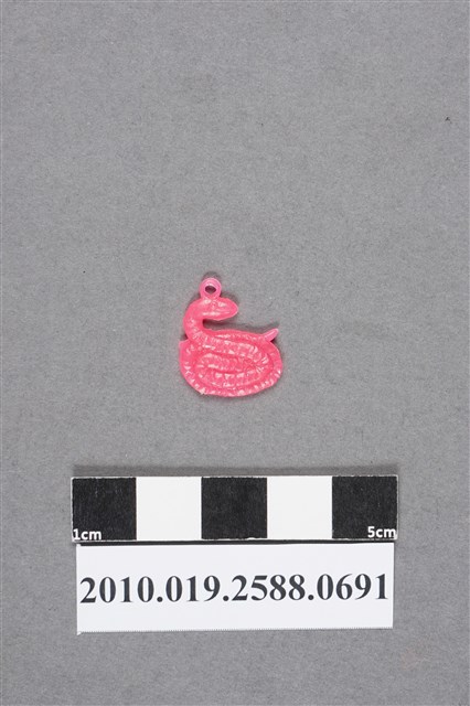 1.本物件為蛇尪仔仙。硬質塑膠材質,扁平,單一不透明粉紅色,雙面浮雕圖案,兩面圖案相同。圖案為身體蜷曲成圈狀的蛇,蛇頭立起,身體有鱗片。頭頂有小吊環。2.尪仔仙尺寸大致可分成小、中、大型,小型約長2-5公分,中型約長8-15公分,顏色以單色為主。有些大型的則可長達30公分左右,以菩薩、神仙和民間傳說故事人物等造型為主,塗上金銀紅黃彩漆等亮色。1960、70年代的尪仔仙多以民間傳說故事、歌仔戲、布袋戲人物為造型。1980年代改以卡通、電玩、漫畫人物造型為主。常見玩法之一為兩人(或多人)各持一只尪仔仙,輪流用手指彈射,看誰的尪仔仙先疊在對方上面,便可贏得對方用來對戰或是約定的尪仔仙。