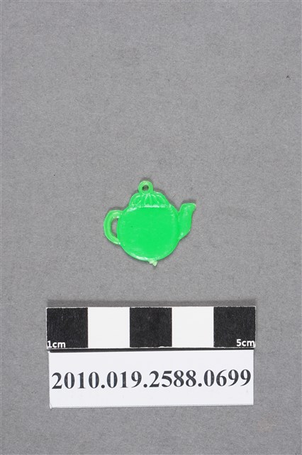 1.本物件為水壺尪仔仙。硬質塑膠材質,扁平,單一不透明綠色,雙面浮雕圖案,兩面圖案相同。圖案為圓身水壺,可見壺嘴和把手,壺蓋上有條紋。有小吊環。2.尪仔仙尺寸大致可分成小、中、大型,小型約長2-5公分,中型約長8-15公分,顏色以單色為主。有些大型的則可長達30公分左右,以菩薩、神仙和民間傳說故事人物等造型為主,塗上金銀紅黃彩漆等亮色。1960、70年代的尪仔仙多以民間傳說故事、歌仔戲、布袋戲人物為造型。1980年代改以卡通、電玩、漫畫人物造型為主。常見玩法之一為兩人(或多人)各持一只尪仔仙,輪流用手指彈射,看誰的尪仔仙先疊在對方上面,便可贏得對方用來對戰或是約定的尪仔仙。