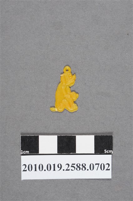 1.本物件為小狗尪仔仙。硬質塑膠材質,扁平,單一不透明黃色,雙面浮雕圖案,兩面圖案相同。圖案為坐姿的小狗,頭往上仰,表面處理呈現根根狗毛的感覺。頭頂有小吊環。2.尪仔仙尺寸大致可分成小、中、大型,小型約長2-5公分,中型約長8-15公分,顏色以單色為主。有些大型的則可長達30公分左右,以菩薩、神仙和民間傳說故事人物等造型為主,塗上金銀紅黃彩漆等亮色。1960、70年代的尪仔仙多以民間傳說故事、歌仔戲、布袋戲人物為造型。1980年代改以卡通、電玩、漫畫人物造型為主。常見玩法之一為兩人(或多人)各持一只尪仔仙,輪流用手指彈射,看誰的尪仔仙先疊在對方上面,便可贏得對方用來對戰或是約定的尪仔仙。