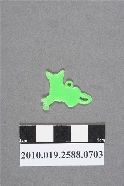 1.本物件為貓咪尪仔仙。硬質塑膠材質,扁平,單一不透明綠色,單面浮雕圖案。正面圖案為半趴在地上的貓咪,有3隻前腳,伸直,尾巴彎曲。背上有小吊環。2.尪仔仙尺寸大致可分成小、中、大型,小型約長2-5公分,中型約長8-15公分,顏色以單色為主。有些大型的則可長達30公分左右,以菩薩、神仙和民間傳說故事人物等造型為主,塗上金銀紅黃彩漆等亮色。1960、70年代的尪仔仙多以民間傳說故事、歌仔戲、布袋戲人物為造型。1980年代改以卡通、電玩、漫畫人物造型為主。常見玩法之一為兩人(或多人)各持一只尪仔仙,輪流用手指彈射,看誰的尪仔仙先疊在對方上面,便可贏得對方用來對戰或是約定的尪仔仙。
