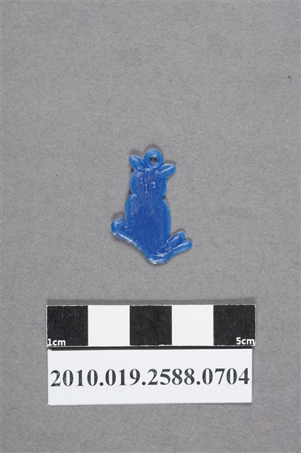 1.本物件為貓頭鷹尪仔仙。硬質塑膠材質,扁平,單一不透明藍色,單面浮雕圖案。正面圖案為站在樹枝上的貓頭鷹,可見鳥爪抓住樹枝,翅膀收在身旁。頭頂上有小吊環。2.尪仔仙尺寸大致可分成小、中、大型,小型約長2-5公分,中型約長8-15公分,顏色以單色為主。有些大型的則可長達30公分左右,以菩薩、神仙和民間傳說故事人物等造型為主,塗上金銀紅黃彩漆等亮色。1960、70年代的尪仔仙多以民間傳說故事、歌仔戲、布袋戲人物為造型。1980年代改以卡通、電玩、漫畫人物造型為主。常見玩法之一為兩人(或多人)各持一只尪仔仙,輪流用手指彈射,看誰的尪仔仙先疊在對方上面,便可贏得對方用來對戰或是約定的尪仔仙。