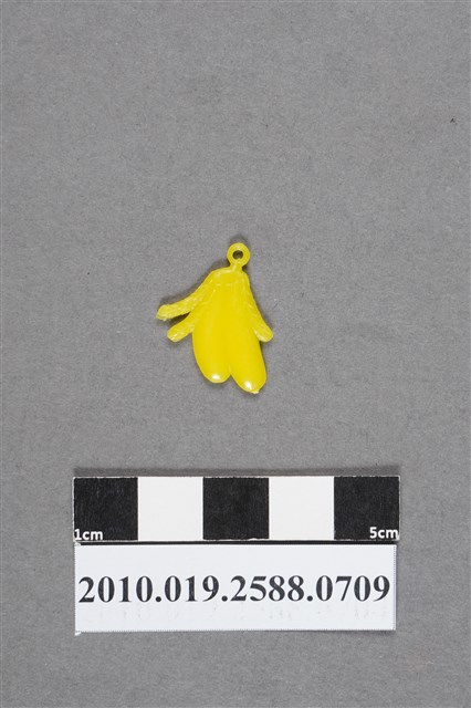 1.本物件為黃色茄子型尪仔仙。硬質塑膠材質,扁平,單一不透明黃色,雙面浮雕圖案,兩面圖案相同。圖案似2條偏橢圓型茄子的物品,短胖型態,頭部長有葉子,然而葉子型態不似茄子植物的葉子。有小吊環。2.尪仔仙尺寸大致可分成小、中、大型,小型約長2-5公分,中型約長8-15公分,顏色以單色為主。有些大型的則可長達30公分左右,以菩薩、神仙和民間傳說故事人物等造型為主,塗上金銀紅黃彩漆等亮色。1960、70年代的尪仔仙多以民間傳說故事、歌仔戲、布袋戲人物為造型。1980年代改以卡通、電玩、漫畫人物造型為主。常見玩法之一為兩人(或多人)各持一只尪仔仙,輪流用手指彈射,看誰的尪仔仙先疊在對方上面,便可贏得對方用來對戰或是約定的尪仔仙。