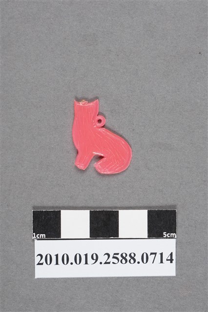 1.本物件為貓咪尪仔仙。硬質塑膠材質,扁平,單一不透明粉紅色,雙面浮雕圖案。正面圖案為坐在地上的貓咪,前腳伸直著地,撐起上半身,可見貓毛毛流,尾巴彎曲。背面有一根根貓毛紋路。有小吊環。2.尪仔仙尺寸大致可分成小、中、大型,小型約長2-5公分,中型約長8-15公分,顏色以單色為主。有些大型的則可長達30公分左右,以菩薩、神仙和民間傳說故事人物等造型為主,塗上金銀紅黃彩漆等亮色。1960、70年代的尪仔仙多以民間傳說故事、歌仔戲、布袋戲人物為造型。1980年代改以卡通、電玩、漫畫人物造型為主。常見玩法之一為兩人(或多人)各持一只尪仔仙,輪流用手指彈射,看誰的尪仔仙先疊在對方上面,便可贏得對方用來對戰或是約定的尪仔仙。