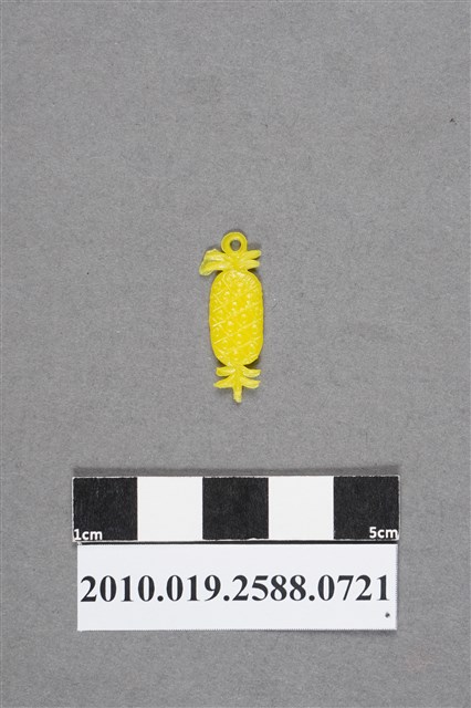 1.本物件為鳳梨尪仔仙。硬質塑膠材質,扁平,單一不透明黃色,雙面浮雕圖案。圖案為下方有果柄,上方有冠芽的鳳梨,可見表面呈菱格紋的果實。冠芽上有小吊環。2.尪仔仙尺寸大致可分成小、中、大型,小型約長2-5公分,中型約長8-15公分,顏色以單色為主。有些大型的則可長達30公分左右,以菩薩、神仙和民間傳說故事人物等造型為主,塗上金銀紅黃彩漆等亮色。1960、70年代的尪仔仙多以民間傳說故事、歌仔戲、布袋戲人物為造型。1980年代改以卡通、電玩、漫畫人物造型為主。常見玩法之一為兩人(或多人)各持一只尪仔仙,輪流用手指彈射,看誰的尪仔仙先疊在對方上面,便可贏得對方用來對戰或是約定的尪仔仙。