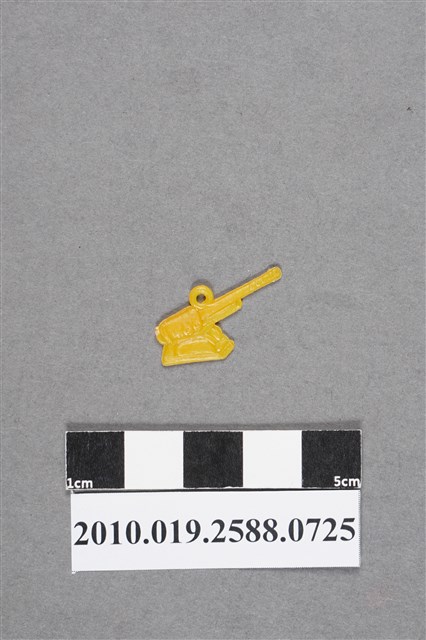 1.本物件為大砲尪仔仙。硬質塑膠材質,扁平,單一不透明黃色,雙面浮雕圖案,兩面圖案相同。圖案為砲口朝上的座型砲,砲口可調整角度的型制。有小吊環。2.尪仔仙尺寸大致可分成小、中、大型,小型約長2-5公分,中型約長8-15公分,顏色以單色為主。有些大型的則可長達30公分左右,以菩薩、神仙和民間傳說故事人物等造型為主,塗上金銀紅黃彩漆等亮色。1960、70年代的尪仔仙多以民間傳說故事、歌仔戲、布袋戲人物為造型。1980年代改以卡通、電玩、漫畫人物造型為主。常見玩法之一為兩人(或多人)各持一只尪仔仙,輪流用手指彈射,看誰的尪仔仙先疊在對方上面,便可贏得對方用來對戰或是約定的尪仔仙。