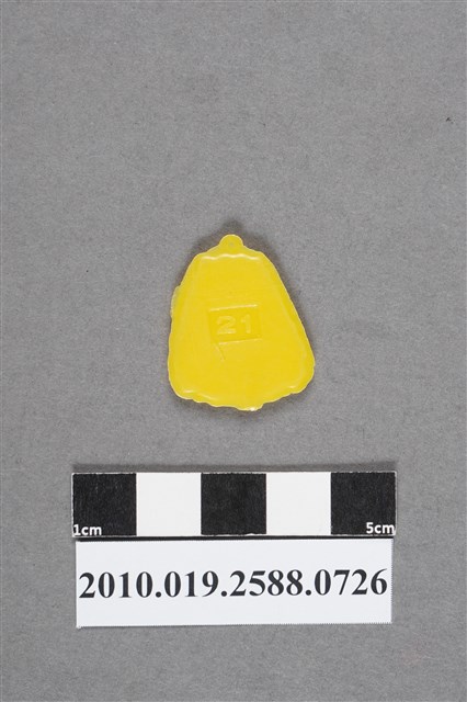 1.本物件為怪物頭像尪仔仙。硬質塑膠材質,扁平,單一不透明黃色,單面浮雕圖案。正面圖案為有不規則紋路的怪物臉部,張嘴,可見獠牙。頭頂有小吊環,背面有21之陽刻字樣,是系列尪仔仙。2.尪仔仙尺寸大致可分成小、中、大型,小型約長2-5公分,中型約長8-15公分,顏色以單色為主。有些大型的則可長達30公分左右,以菩薩、神仙和民間傳說故事人物等造型為主,塗上金銀紅黃彩漆等亮色。1960、70年代的尪仔仙多以民間傳說故事、歌仔戲、布袋戲人物為造型。1980年代改以卡通、電玩、漫畫人物造型為主。常見玩法之一為兩人(或多人)各持一只尪仔仙,輪流用手指彈射,看誰的尪仔仙先疊在對方上面,便可贏得對方用來對戰或是約定的尪仔仙。