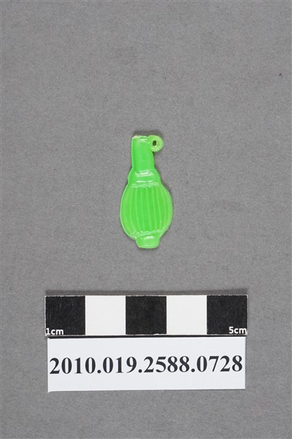 1.本物件為瓶子尪仔仙。硬質塑膠材質,扁平,單一不透明綠色,雙面浮雕圖案,兩面圖案相同。圖案為瓶肚呈圓弧型的瓶子,瓶身表面有直條紋。有小吊環。2.尪仔仙尺寸大致可分成小、中、大型,小型約長2-5公分,中型約長8-15公分,顏色以單色為主。有些大型的則可長達30公分左右,以菩薩、神仙和民間傳說故事人物等造型為主,塗上金銀紅黃彩漆等亮色。1960、70年代的尪仔仙多以民間傳說故事、歌仔戲、布袋戲人物為造型。1980年代改以卡通、電玩、漫畫人物造型為主。常見玩法之一為兩人(或多人)各持一只尪仔仙,輪流用手指彈射,看誰的尪仔仙先疊在對方上面,便可贏得對方用來對戰或是約定的尪仔仙。