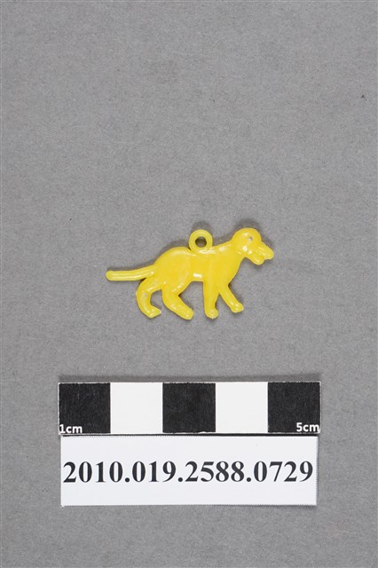 1.本物件為站姿狗型尪仔仙。硬質塑膠材質,扁平,單一不透明黃色,雙面浮雕圖案,兩面圖案相同。圖案似狗型,嘴型似狗式口吻,有尾巴和4條腿,但不見耳朵。背上有小吊環。2.尪仔仙尺寸大致可分成小、中、大型,小型約長2-5公分,中型約長8-15公分,顏色以單色為主。有些大型的則可長達30公分左右,以菩薩、神仙和民間傳說故事人物等造型為主,塗上金銀紅黃彩漆等亮色。1960、70年代的尪仔仙多以民間傳說故事、歌仔戲、布袋戲人物為造型。1980年代改以卡通、電玩、漫畫人物造型為主。常見玩法之一為兩人(或多人)各持一只尪仔仙,輪流用手指彈射,看誰的尪仔仙先疊在對方上面,便可贏得對方用來對戰或是約定的尪仔仙。