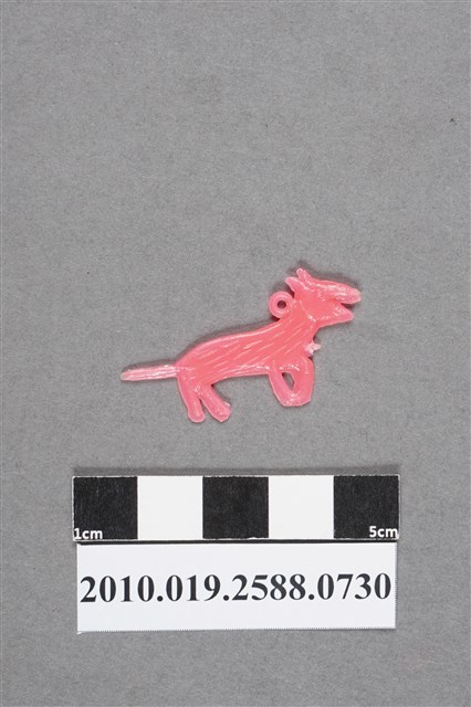 1.本物件為站姿狗型尪仔仙。硬質塑膠材質,扁平,單一不透明粉紅色,雙面浮雕圖案,兩面圖案相同。圖案似狗型,有耳朵、尾巴和4條腿,表面處理呈現出根根狗毛的感覺。頸上有小吊環。2.尪仔仙尺寸大致可分成小、中、大型,小型約長2-5公分,中型約長8-15公分,顏色以單色為主。有些大型的則可長達30公分左右,以菩薩、神仙和民間傳說故事人物等造型為主,塗上金銀紅黃彩漆等亮色。1960、70年代的尪仔仙多以民間傳說故事、歌仔戲、布袋戲人物為造型。1980年代改以卡通、電玩、漫畫人物造型為主。常見玩法之一為兩人(或多人)各持一只尪仔仙,輪流用手指彈射,看誰的尪仔仙先疊在對方上面,便可贏得對方用來對戰或是約定的尪仔仙。