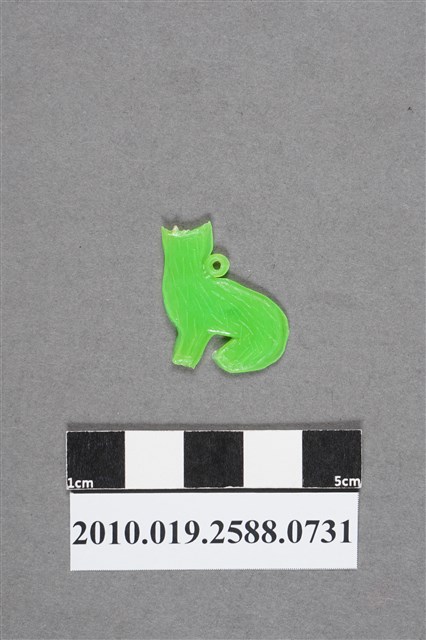 1.本物件為貓咪尪仔仙。硬質塑膠材質,扁平,單一不透明綠色,雙面浮雕圖案。正面圖案為坐在地上的貓咪,前腳伸直著地,撐起上半身,可見貓毛毛流,尾巴彎曲。背面有一根根貓毛紋路。有小吊環。2.尪仔仙尺寸大致可分成小、中、大型,小型約長2-5公分,中型約長8-15公分,顏色以單色為主。有些大型的則可長達30公分左右,以菩薩、神仙和民間傳說故事人物等造型為主,塗上金銀紅黃彩漆等亮色。1960、70年代的尪仔仙多以民間傳說故事、歌仔戲、布袋戲人物為造型。1980年代改以卡通、電玩、漫畫人物造型為主。常見玩法之一為兩人(或多人)各持一只尪仔仙,輪流用手指彈射,看誰的尪仔仙先疊在對方上面,便可贏得對方用來對戰或是約定的尪仔仙。