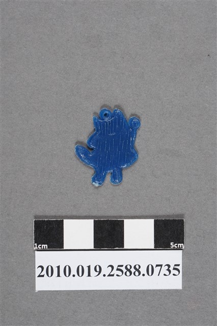 1.本物件為貓頭人型尪仔仙。硬質塑膠材質,扁平,單一不透明藍色,雙面浮雕圖案。正面圖案為站立的貓頭人型,身上穿有裙裝,左手舉起,右手放胸前,尾巴翹起。背面有斜線似為根根貓毛。頭頂有小吊環。2.尪仔仙尺寸大致可分成小、中、大型,小型約長2-5公分,中型約長8-15公分,顏色以單色為主。有些大型的則可長達30公分左右,以菩薩、神仙和民間傳說故事人物等造型為主,塗上金銀紅黃彩漆等亮色。1960、70年代的尪仔仙多以民間傳說故事、歌仔戲、布袋戲人物為造型。1980年代改以卡通、電玩、漫畫人物造型為主。常見玩法之一為兩人(或多人)各持一只尪仔仙,輪流用手指彈射,看誰的尪仔仙先疊在對方上面,便可贏得對方用來對戰或是約定的尪仔仙。