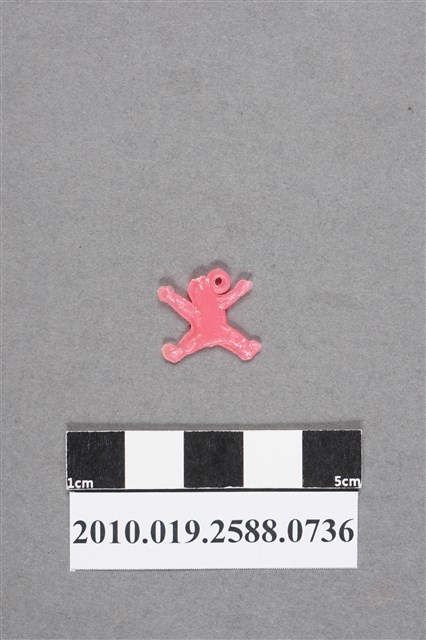1.本物件為大字人型尪仔仙。硬質塑膠材質,扁平,單一不透明粉紅色,單面浮雕圖案。正面圖案為雙手往上舉,雙腳打開的人型,呈現大字型的樣子,可見衣服上有3顆扣子。有小吊環。2.尪仔仙尺寸大致可分成小、中、大型,小型約長2-5公分,中型約長8-15公分,顏色以單色為主。有些大型的則可長達30公分左右,以菩薩、神仙和民間傳說故事人物等造型為主,塗上金銀紅黃彩漆等亮色。1960、70年代的尪仔仙多以民間傳說故事、歌仔戲、布袋戲人物為造型。1980年代改以卡通、電玩、漫畫人物造型為主。常見玩法之一為兩人(或多人)各持一只尪仔仙,輪流用手指彈射,看誰的尪仔仙先疊在對方上面,便可贏得對方用來對戰或是約定的尪仔仙。