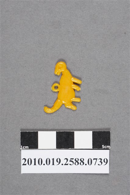 1.本物件為黃色恐龍型尪仔仙。硬質塑膠材質,扁平,單一不透明黃色,雙面浮雕圖案,兩面圖案相同。圖案似用雙腳站立的恐龍動物,轉頭往後看,僅見眼睛和嘴巴,有上肢和尾巴。背上有小吊環。2.尪仔仙尺寸大致可分成小、中、大型,小型約長2-5公分,中型約長8-15公分,顏色以單色為主。有些大型的則可長達30公分左右,以菩薩、神仙和民間傳說故事人物等造型為主,塗上金銀紅黃彩漆等亮色。1960、70年代的尪仔仙多以民間傳說故事、歌仔戲、布袋戲人物為造型。1980年代改以卡通、電玩、漫畫人物造型為主。常見玩法之一為兩人(或多人)各持一只尪仔仙,輪流用手指彈射,看誰的尪仔仙先疊在對方上面,便可贏得對方用來對戰或是約定的尪仔仙。
