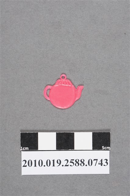 1.本物件為水壺尪仔仙。硬質塑膠材質,扁平,單一不透明粉紅色,雙面浮雕圖案,兩面圖案相同。圖案為圓身水壺,可見壺嘴和把手,壺蓋上有條紋。有小吊環。2.尪仔仙尺寸大致可分成小、中、大型,小型約長2-5公分,中型約長8-15公分,顏色以單色為主。有些大型的則可長達30公分左右,以菩薩、神仙和民間傳說故事人物等造型為主,塗上金銀紅黃彩漆等亮色。1960、70年代的尪仔仙多以民間傳說故事、歌仔戲、布袋戲人物為造型。1980年代改以卡通、電玩、漫畫人物造型為主。常見玩法之一為兩人(或多人)各持一只尪仔仙,輪流用手指彈射,看誰的尪仔仙先疊在對方上面,便可贏得對方用來對戰或是約定的尪仔仙。