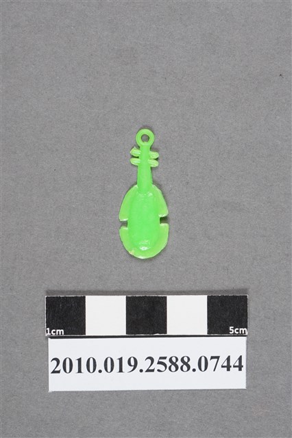 1.本物件為小提琴尪仔仙。硬質塑膠材質,扁平,單一不透明綠色,雙面浮雕圖案,兩面圖案相同。依其弦軸數量和設置來看,此圖案為小提琴,可見琴頭、弦軸、指板和琴身的部分,無弦。琴頭有小吊環。2.尪仔仙尺寸大致可分成小、中、大型,小型約長2-5公分,中型約長8-15公分,顏色以單色為主。有些大型的則可長達30公分左右,以菩薩、神仙和民間傳說故事人物等造型為主,塗上金銀紅黃彩漆等亮色。1960、70年代的尪仔仙多以民間傳說故事、歌仔戲、布袋戲人物為造型。1980年代改以卡通、電玩、漫畫人物造型為主。常見玩法之一為兩人(或多人)各持一只尪仔仙,輪流用手指彈射,看誰的尪仔仙先疊在對方上面,便可贏得對方用來對戰或是約定的尪仔仙。