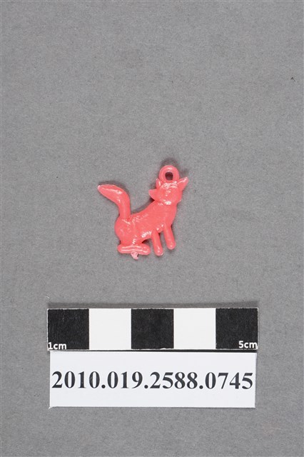 1.本物件為坐姿狗型尪仔仙。硬質塑膠材質,扁平,單一不透明粉紅色,雙面浮雕圖案。圖案似前腳立起,後腳呈坐姿的狗型動物,難以辨識臉部表情,尾巴翹起。頭頂有小吊環。2.尪仔仙尺寸大致可分成小、中、大型,小型約長2-5公分,中型約長8-15公分,顏色以單色為主。有些大型的則可長達30公分左右,以菩薩、神仙和民間傳說故事人物等造型為主,塗上金銀紅黃彩漆等亮色。1960、70年代的尪仔仙多以民間傳說故事、歌仔戲、布袋戲人物為造型。1980年代改以卡通、電玩、漫畫人物造型為主。常見玩法之一為兩人(或多人)各持一只尪仔仙,輪流用手指彈射,看誰的尪仔仙先疊在對方上面,便可贏得對方用來對戰或是約定的尪仔仙。