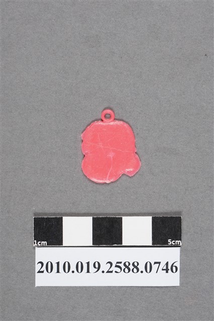 1.本物件為孫悟空頭像尪仔仙。硬質塑膠材質,扁平,單一不透明粉紅色,單面浮雕圖案。正面圖案為戴著金箍的孫悟空頭部,額頭中央可見金箍的造型。頭頂有小吊環。孫悟空為西遊記之角色。