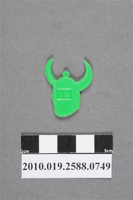 1.本物件為怪物頭像尪仔仙。硬質塑膠材質,扁平,單一不透明綠色,單面浮雕圖案。正面圖案為頭上戴有雙角頭盔的怪物臉部,頭盔中間有圖騰,怪物嘴大,牙齒為尖牙。頭頂有小吊環,背面有19之陽刻字樣,是系列尪仔仙。2.尪仔仙尺寸大致可分成小、中、大型,小型約長2-5公分,中型約長8-15公分,顏色以單色為主。有些大型的則可長達30公分左右,以菩薩、神仙和民間傳說故事人物等造型為主,塗上金銀紅黃彩漆等亮色。1960、70年代的尪仔仙多以民間傳說故事、歌仔戲、布袋戲人物為造型。1980年代改以卡通、電玩、漫畫人物造型為主。常見玩法之一為兩人(或多人)各持一只尪仔仙,輪流用手指彈射,看誰的尪仔仙先疊在對方上面,便可贏得對方用來對戰或是約定的尪仔仙。
