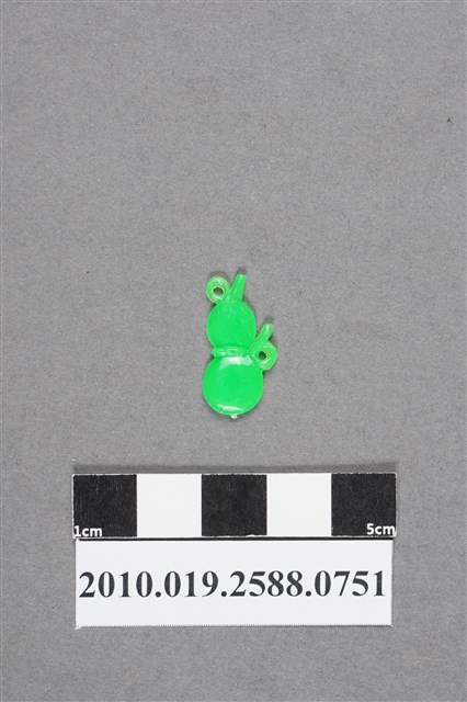 1.本物件為葫蘆尪仔仙。硬質塑膠材質,扁平,單一不透明綠色,雙面浮雕圖案,兩面圖案相同。圖案為立起來的葫蘆,有葫蘆嘴,葫蘆中間有綁帶。有小吊環。2.尪仔仙尺寸大致可分成小、中、大型,小型約長2-5公分,中型約長8-15公分,顏色以單色為主。有些大型的則可長達30公分左右,以菩薩、神仙和民間傳說故事人物等造型為主,塗上金銀紅黃彩漆等亮色。1960、70年代的尪仔仙多以民間傳說故事、歌仔戲、布袋戲人物為造型。1980年代改以卡通、電玩、漫畫人物造型為主。常見玩法之一為兩人(或多人)各持一只尪仔仙,輪流用手指彈射,看誰的尪仔仙先疊在對方上面,便可贏得對方用來對戰或是約定的尪仔仙。