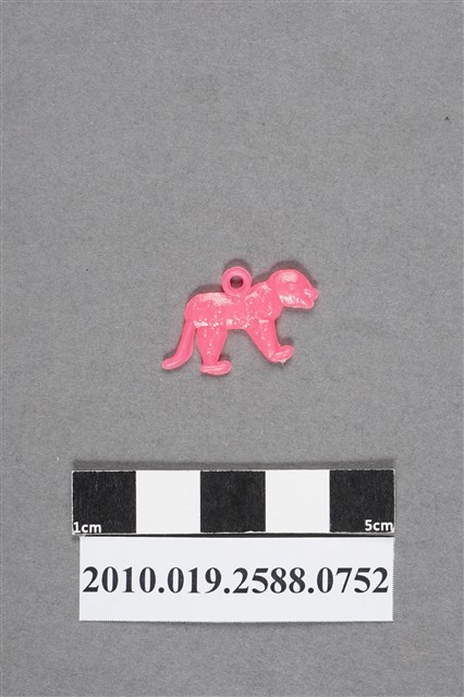 1.本物件為站姿狗型尪仔仙。硬質塑膠材質,扁平,單一不透明粉紅色,雙面浮雕圖案,兩面圖案相同。圖案似狗型,身上有斑點,嘴型似狗式口吻,有尾巴和腿,但不見耳朵。背上有小吊環。2.尪仔仙尺寸大致可分成小、中、大型,小型約長2-5公分,中型約長8-15公分,顏色以單色為主。有些大型的則可長達30公分左右,以菩薩、神仙和民間傳說故事人物等造型為主,塗上金銀紅黃彩漆等亮色。1960、70年代的尪仔仙多以民間傳說故事、歌仔戲、布袋戲人物為造型。1980年代改以卡通、電玩、漫畫人物造型為主。常見玩法之一為兩人(或多人)各持一只尪仔仙,輪流用手指彈射,看誰的尪仔仙先疊在對方上面,便可贏得對方用來對戰或是約定的尪仔仙。