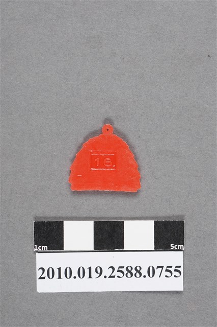 1.本物件為怪物頭像尪仔仙。硬質塑膠材質,扁平,單一不透明橘紅色,單面浮雕圖案。正面圖案為獅頭怪物臉部,外圈有片片扇狀組成鬃毛的樣子,嘴巴張開露出尖牙。頭頂有小吊環,背面有16之陽刻字樣,是系列尪仔仙。2.尪仔仙尺寸大致可分成小、中、大型,小型約長2-5公分,中型約長8-15公分,顏色以單色為主。有些大型的則可長達30公分左右,以菩薩、神仙和民間傳說故事人物等造型為主,塗上金銀紅黃彩漆等亮色。1960、70年代的尪仔仙多以民間傳說故事、歌仔戲、布袋戲人物為造型。1980年代改以卡通、電玩、漫畫人物造型為主。常見玩法之一為兩人(或多人)各持一只尪仔仙,輪流用手指彈射,看誰的尪仔仙先疊在對方上面,便可贏得對方用來對戰或是約定的尪仔仙。