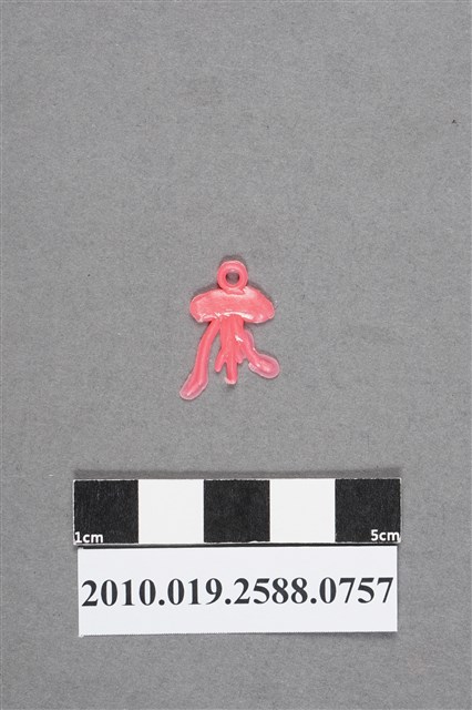 1.本物件為水母尪仔仙。硬質塑膠材質,扁平,單一不透明粉紅色,雙面浮雕圖案,兩面圖案相同。圖案為水母,可見圓傘狀身體和口腕。有小吊環。2.尪仔仙尺寸大致可分成小、中、大型,小型約長2-5公分,中型約長8-15公分,顏色以單色為主。有些大型的則可長達30公分左右,以菩薩、神仙和民間傳說故事人物等造型為主,塗上金銀紅黃彩漆等亮色。1960、70年代的尪仔仙多以民間傳說故事、歌仔戲、布袋戲人物為造型。1980年代改以卡通、電玩、漫畫人物造型為主。常見玩法之一為兩人(或多人)各持一只尪仔仙,輪流用手指彈射,看誰的尪仔仙先疊在對方上面,便可贏得對方用來對戰或是約定的尪仔仙。