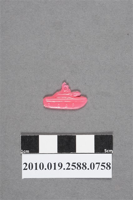 1.本物件為坦克車尪仔仙。硬質塑膠材質,扁平,單一不透明粉紅色,雙面浮雕圖案,兩面圖案相同。圖案為坦克車側面,可見大砲管和履帶。車頂有小吊環。2.尪仔仙尺寸大致可分成小、中、大型,小型約長2-5公分,中型約長8-15公分,顏色以單色為主。有些大型的則可長達30公分左右,以菩薩、神仙和民間傳說故事人物等造型為主,塗上金銀紅黃彩漆等亮色。1960、70年代的尪仔仙多以民間傳說故事、歌仔戲、布袋戲人物為造型。1980年代改以卡通、電玩、漫畫人物造型為主。常見玩法之一為兩人(或多人)各持一只尪仔仙,輪流用手指彈射,看誰的尪仔仙先疊在對方上面,便可贏得對方用來對戰或是約定的尪仔仙。