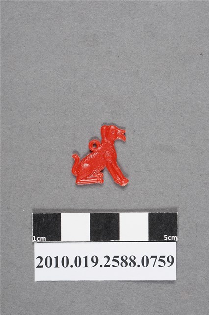 1.本物件為小狗尪仔仙。硬質塑膠材質,扁平,單一不透明紅色,雙面浮雕圖案,兩面圖案相同。圖案為用後腳坐著,用前腳撐住身體的小狗,嘴巴張開,尾巴翹起,表面處理呈現根根狗毛的感覺。背上有小吊環。2.尪仔仙尺寸大致可分成小、中、大型,小型約長2-5公分,中型約長8-15公分,顏色以單色為主。有些大型的則可長達30公分左右,以菩薩、神仙和民間傳說故事人物等造型為主,塗上金銀紅黃彩漆等亮色。1960、70年代的尪仔仙多以民間傳說故事、歌仔戲、布袋戲人物為造型。1980年代改以卡通、電玩、漫畫人物造型為主。常見玩法之一為兩人(或多人)各持一只尪仔仙,輪流用手指彈射,看誰的尪仔仙先疊在對方上面,便可贏得對方用來對戰或是約定的尪仔仙。