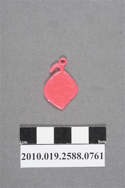 1.本物件為粉紅色尪仔仙。硬質塑膠材質,扁平,單一不透明粉紅色,單面浮雕圖案。無法判斷正面圖案為何,似中間有主葉脈的圓葉,周圍有放射狀紋路。有小吊環。2.尪仔仙尺寸大致可分成小、中、大型,小型約長2-5公分,中型約長8-15公分,顏色以單色為主。有些大型的則可長達30公分左右,以菩薩、神仙和民間傳說故事人物等造型為主,塗上金銀紅黃彩漆等亮色。1960、70年代的尪仔仙多以民間傳說故事、歌仔戲、布袋戲人物為造型。1980年代改以卡通、電玩、漫畫人物造型為主。常見玩法之一為兩人(或多人)各持一只尪仔仙,輪流用手指彈射,看誰的尪仔仙先疊在對方上面,便可贏得對方用來對戰或是約定的尪仔仙。