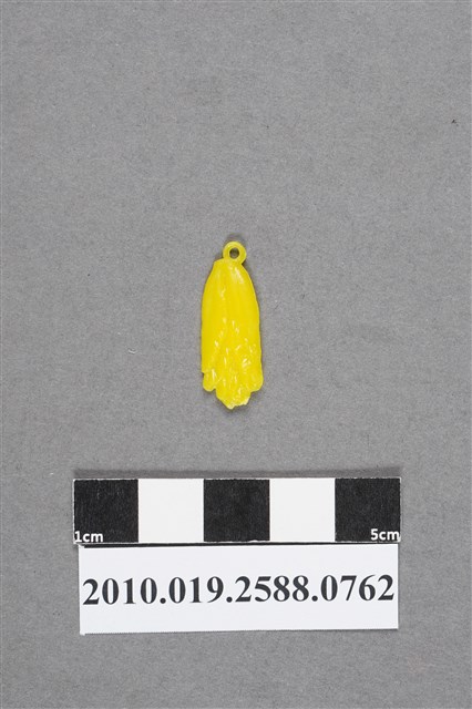 1.本物件為蔬菜尪仔仙。硬質塑膠材質,扁平,單一不透明黃色,雙面浮雕圖案,兩面圖案相同。圖案為有多層菜葉緊緊包裹在一起,形成圓柱體的半結球蔬菜。有小吊環。2.尪仔仙尺寸大致可分成小、中、大型,小型約長2-5公分,中型約長8-15公分,顏色以單色為主。有些大型的則可長達30公分左右,以菩薩、神仙和民間傳說故事人物等造型為主,塗上金銀紅黃彩漆等亮色。1960、70年代的尪仔仙多以民間傳說故事、歌仔戲、布袋戲人物為造型。1980年代改以卡通、電玩、漫畫人物造型為主。常見玩法之一為兩人(或多人)各持一只尪仔仙,輪流用手指彈射,看誰的尪仔仙先疊在對方上面,便可贏得對方用來對戰或是約定的尪仔仙。