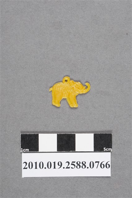 1.本物件為大象尪仔仙。硬質塑膠材質,扁平,單一不透明黃色,雙面浮雕圖案,兩面圖案相同。圖案為鼻子向上捲起的大象,象牙和尾巴短,表面處理有象皮粗糙紋路的感覺。背上有小吊環。2.尪仔仙尺寸大致可分成小、中、大型,小型約長2-5公分,中型約長8-15公分,顏色以單色為主。有些大型的則可長達30公分左右,以菩薩、神仙和民間傳說故事人物等造型為主,塗上金銀紅黃彩漆等亮色。1960、70年代的尪仔仙多以民間傳說故事、歌仔戲、布袋戲人物為造型。1980年代改以卡通、電玩、漫畫人物造型為主。常見玩法之一為兩人(或多人)各持一只尪仔仙,輪流用手指彈射,看誰的尪仔仙先疊在對方上面,便可贏得對方用來對戰或是約定的尪仔仙。