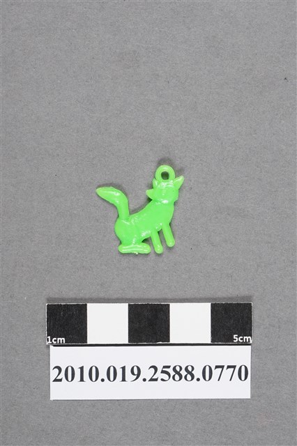 1.本物件為坐姿狗型尪仔仙。硬質塑膠材質,扁平,單一不透明綠色,雙面浮雕圖案。圖案似前腳立起,後腳呈坐姿的狗型動物,難以辨識臉部表情,尾巴翹起。頭頂有小吊環。2.尪仔仙尺寸大致可分成小、中、大型,小型約長2-5公分,中型約長8-15公分,顏色以單色為主。有些大型的則可長達30公分左右,以菩薩、神仙和民間傳說故事人物等造型為主,塗上金銀紅黃彩漆等亮色。1960、70年代的尪仔仙多以民間傳說故事、歌仔戲、布袋戲人物為造型。1980年代改以卡通、電玩、漫畫人物造型為主。常見玩法之一為兩人(或多人)各持一只尪仔仙,輪流用手指彈射,看誰的尪仔仙先疊在對方上面,便可贏得對方用來對戰或是約定的尪仔仙。