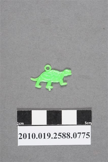 1.本物件為烏龜尪仔仙。硬質塑膠材質,扁平,單一不透明綠色,雙面浮雕圖案,兩面圖案相同。圖案為用3隻腳站立的烏龜,有眼睛、嘴巴和尾巴,龜殼上有花紋。比起正常烏龜體型,腳型略長。背上有小吊環。2.尪仔仙尺寸大致可分成小、中、大型,小型約長2-5公分,中型約長8-15公分,顏色以單色為主。有些大型的則可長達30公分左右,以菩薩、神仙和民間傳說故事人物等造型為主,塗上金銀紅黃彩漆等亮色。1960、70年代的尪仔仙多以民間傳說故事、歌仔戲、布袋戲人物為造型。1980年代改以卡通、電玩、漫畫人物造型為主。常見玩法之一為兩人(或多人)各持一只尪仔仙,輪流用手指彈射,看誰的尪仔仙先疊在對方上面,便可贏得對方用來對戰或是約定的尪仔仙。