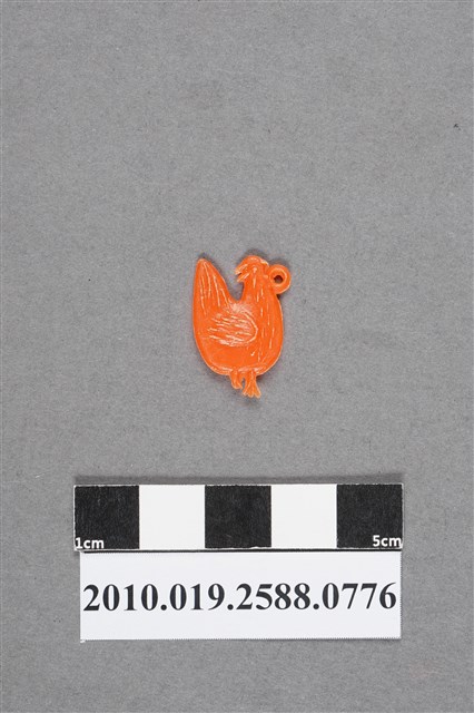 1.本物件為雞尪仔仙。硬質塑膠材質,扁平,單一不透明橘色,雙面浮雕圖案,兩面圖案相同。圖案為站立的雞,頭往後轉,翅膀收起。有小吊環。2.尪仔仙尺寸大致可分成小、中、大型,小型約長2-5公分,中型約長8-15公分,顏色以單色為主。有些大型的則可長達30公分左右,以菩薩、神仙和民間傳說故事人物等造型為主,塗上金銀紅黃彩漆等亮色。1960、70年代的尪仔仙多以民間傳說故事、歌仔戲、布袋戲人物為造型。1980年代改以卡通、電玩、漫畫人物造型為主。常見玩法之一為兩人(或多人)各持一只尪仔仙,輪流用手指彈射,看誰的尪仔仙先疊在對方上面,便可贏得對方用來對戰或是約定的尪仔仙。